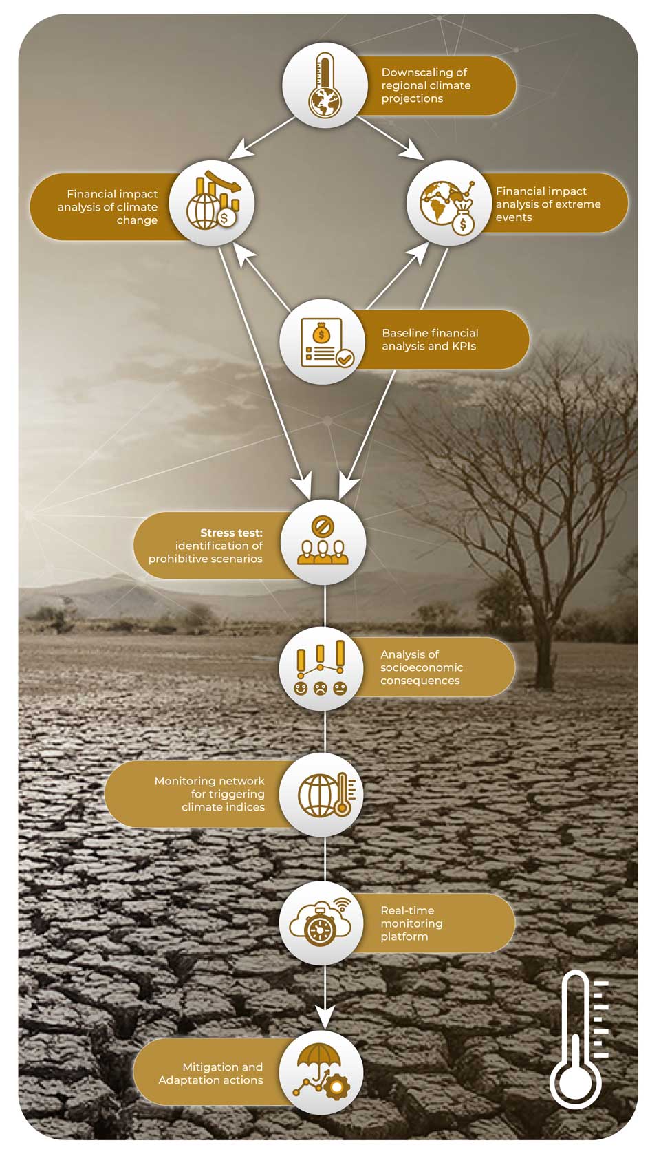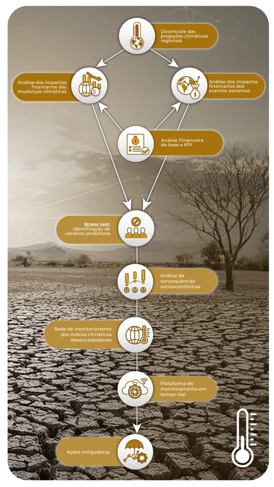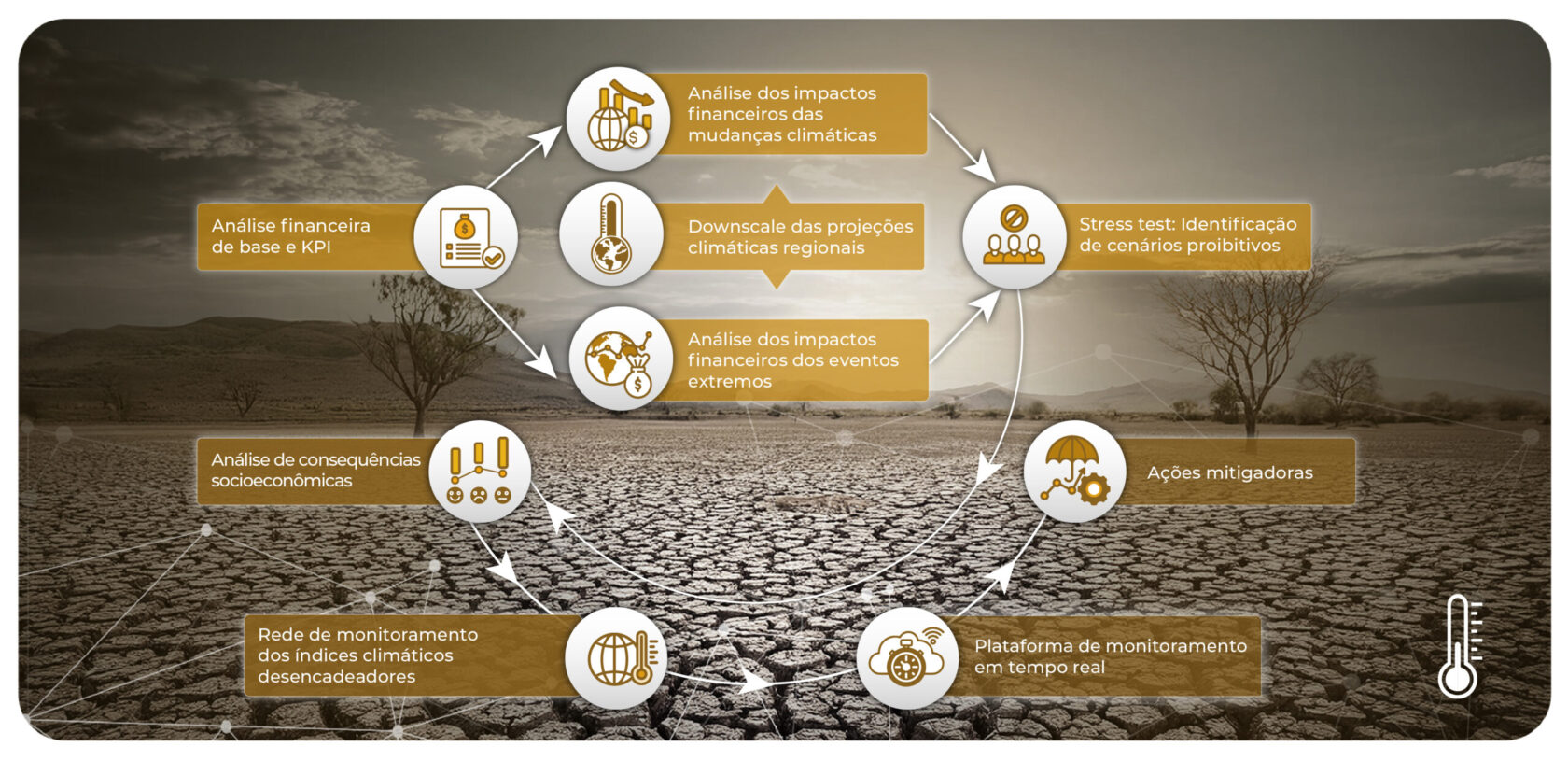 Atuamos na análise e gestão integrada de riscos hidrogeoclimáticos, oferecendo soluções técnicas que unem avaliação financeira na mitigação de riscos, gestão de riscos em infraestrutura e gestão de riscos hídricos. Nosso objetivo é apoiar a tomada de decisão com base em evidências, promovendo resiliência, sustentabilidade e segurança para a indústria e população.